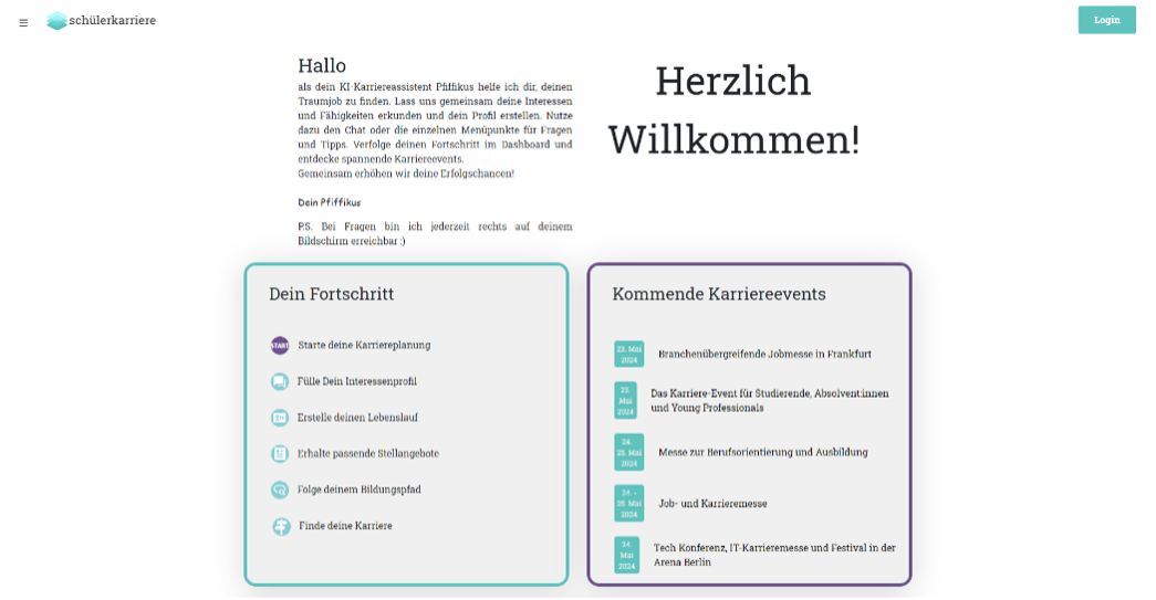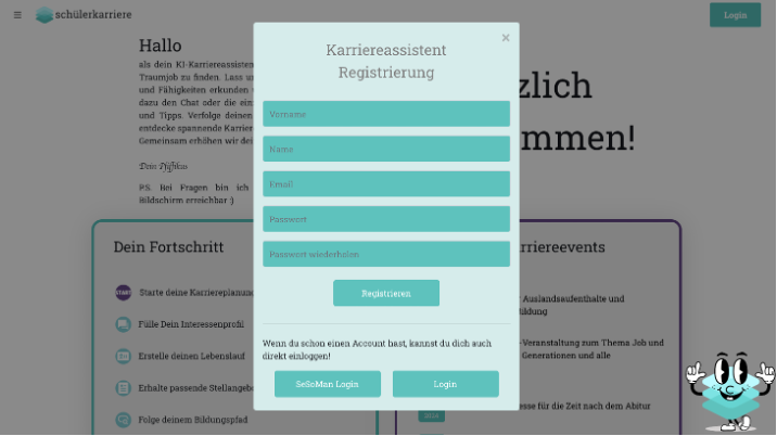 Fatma reviews the Karriereassistent without logging in, gaining insights into how the platform could benefit her. The platform’s interface presents an overview of its capabilities, highlighting the personalized recommendations it offers. Karriereassistent then prompts Fatma to log in to access her data from Sokrates.
