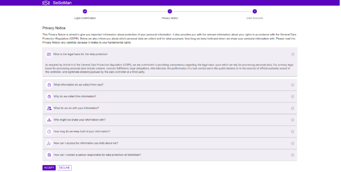 Fatma uses SeSoMan again to log into Karriereassistent. The SeSoMan sends a notification requesting permission to access the platform and displays a privacy notice detailing how Fatma’s data will be used. This transparency is crucial for informed consent, ensuring that Fatma understands how her data will be processed.