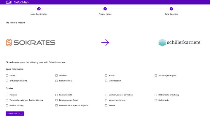 Once Fatma consents to the Privacy Notice, a structured view of the data available for sharing from Sokrates to Karriereassistent is presented. Fatma can select which specific data she wishes to share. This ensures that only the data Fatma deems necessary is transferred, maintaining her ownership, control and data privacy.
